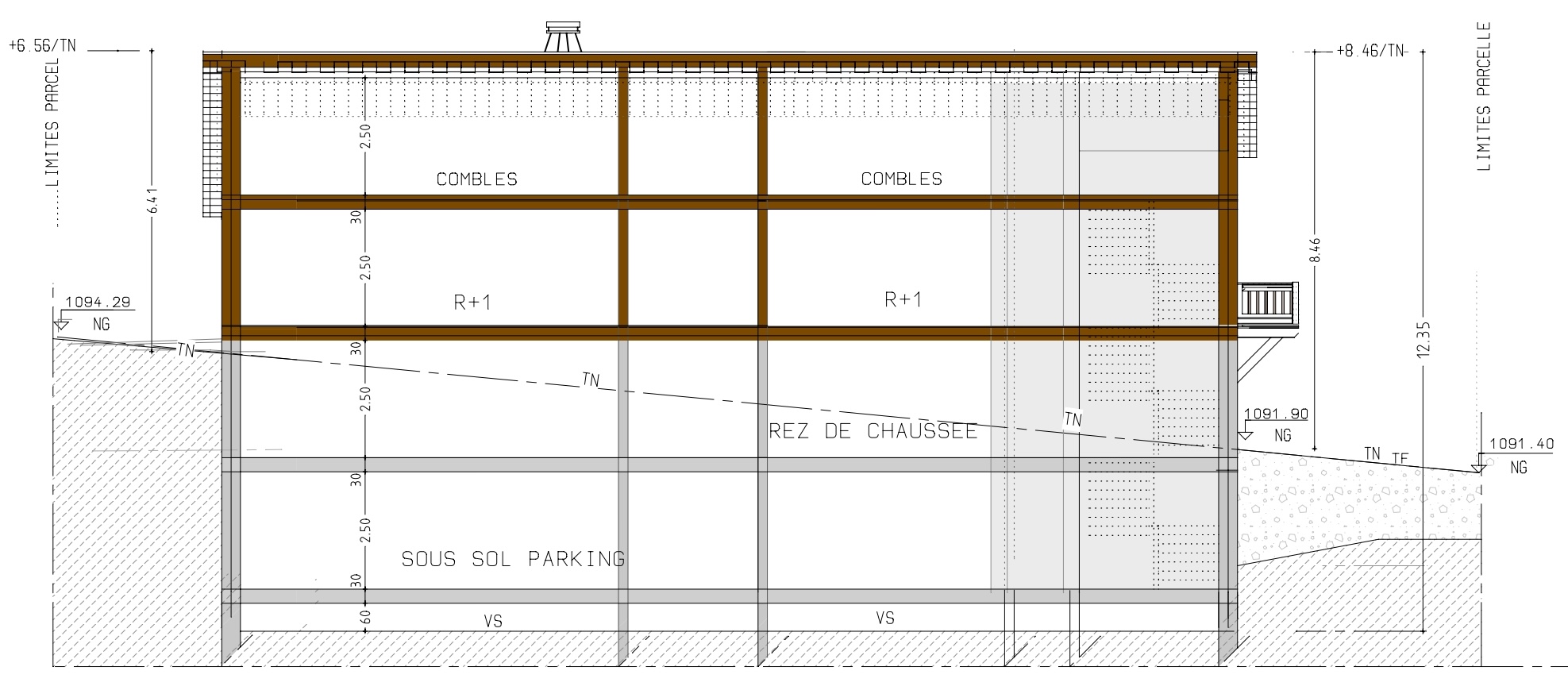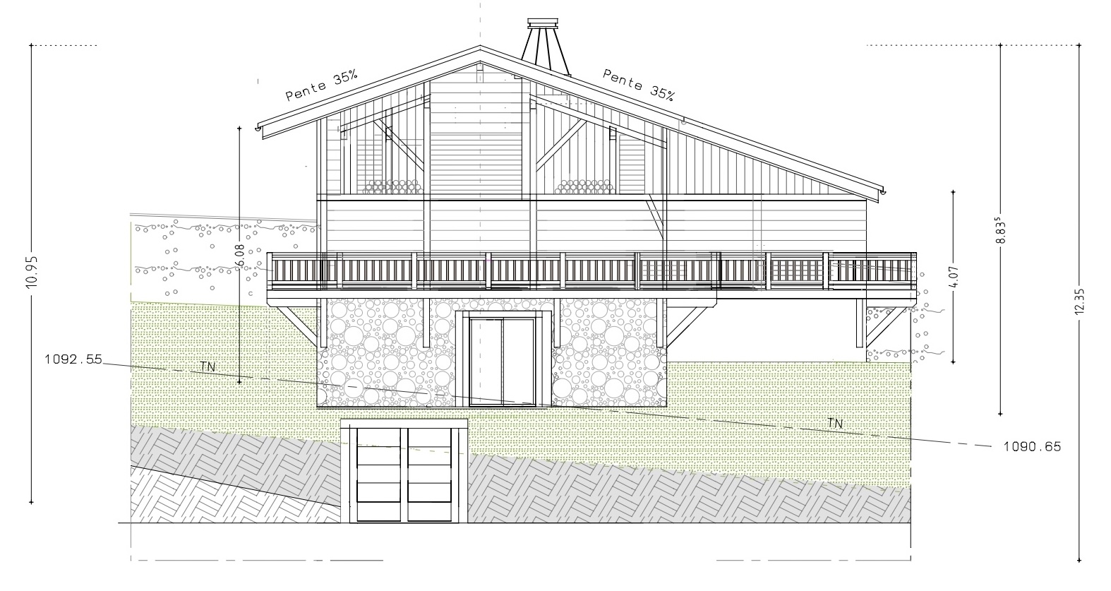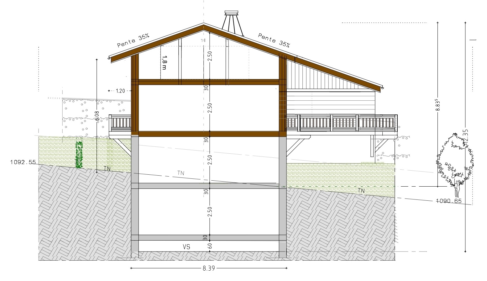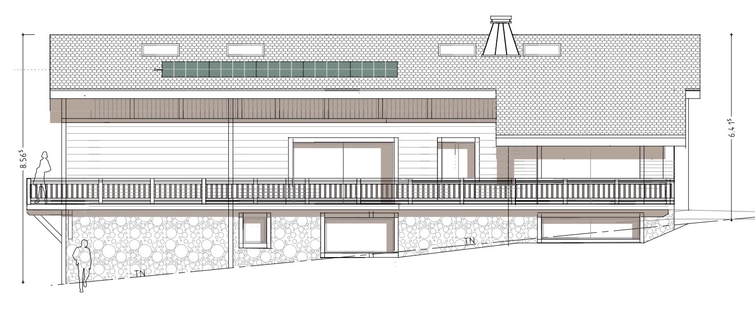 L’architecture du chalet s’agence sur quatre niveaux (sous-sol, rez-de-chaussée, premier étage et combles), afin de s’adapter au mieux à la pente naturelle du terrain.