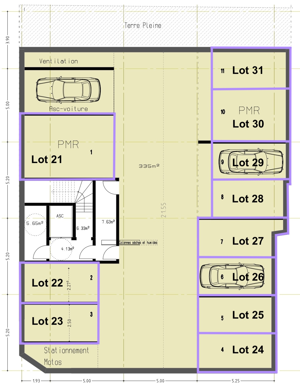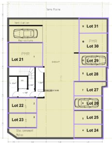 Le sous-sol comprend onze parkings desservis par un ascenseur pour voiture et un ascenseur pour piéton. Le rez-de-chaussée est occupé par les trois locaux commerciaux.